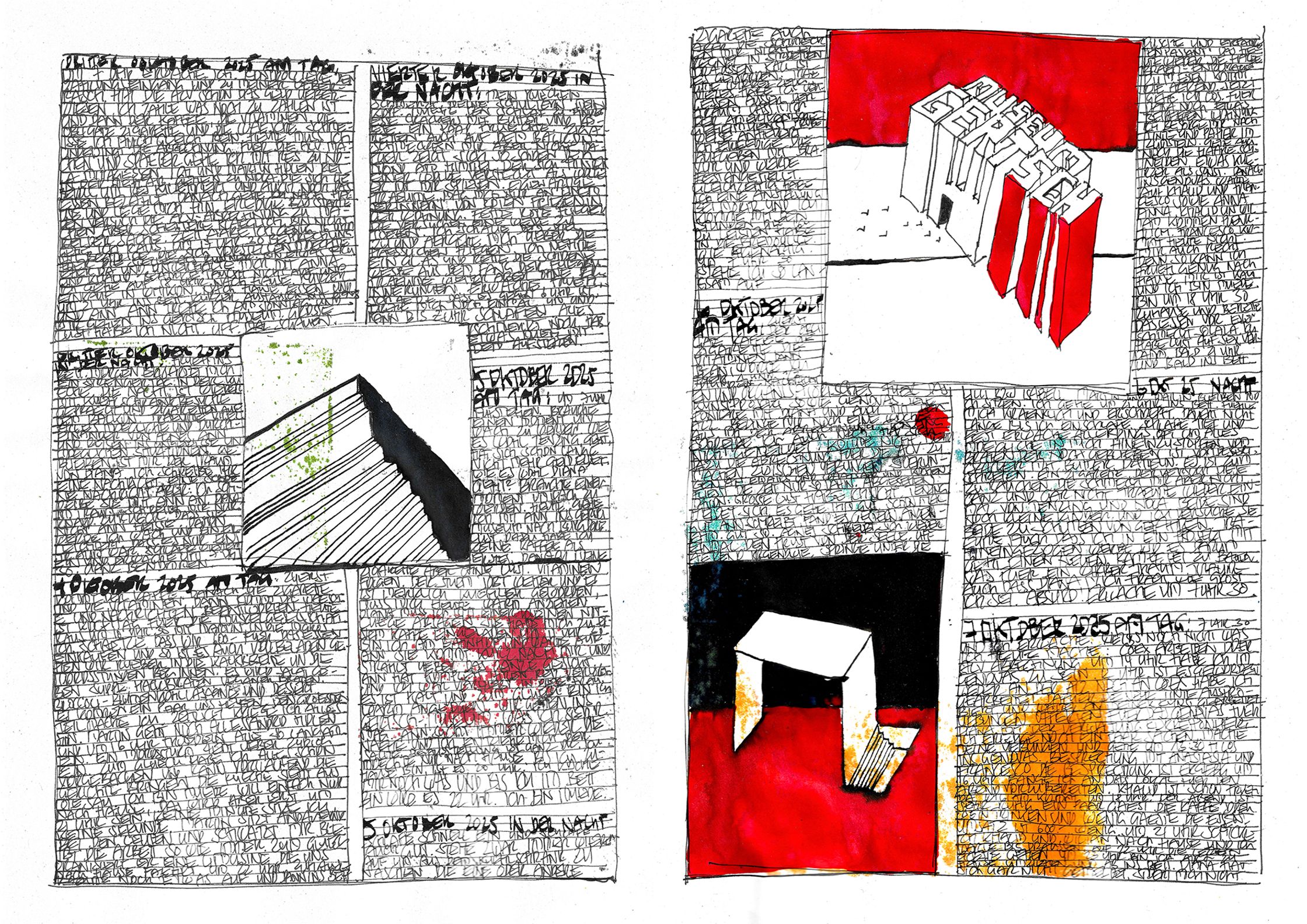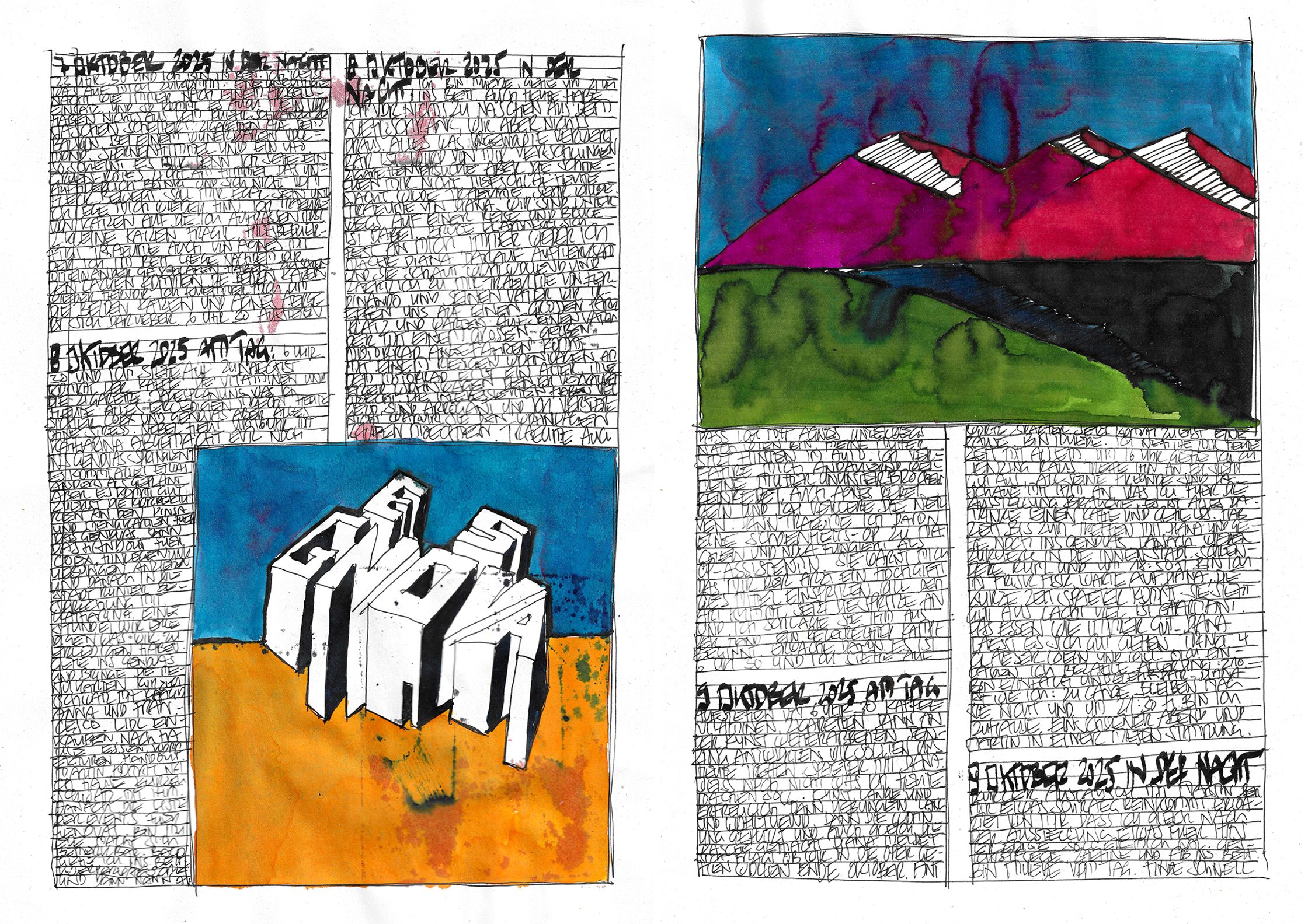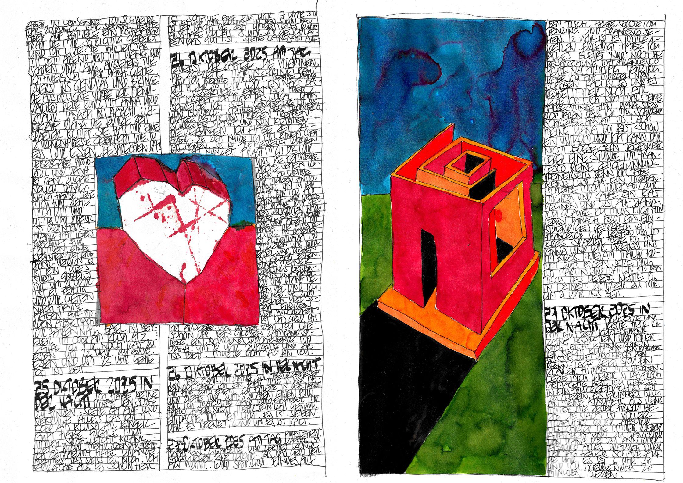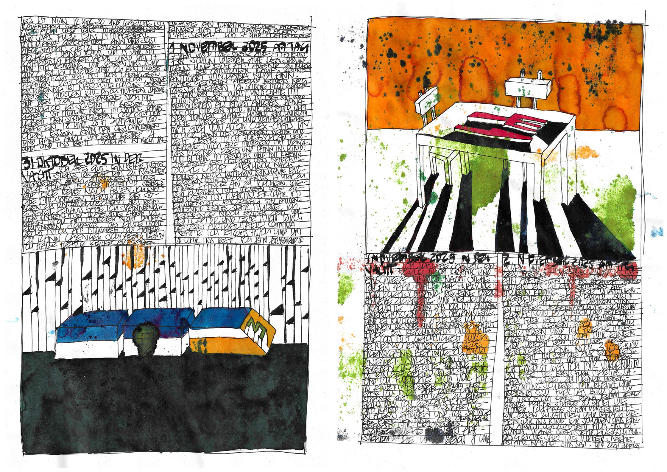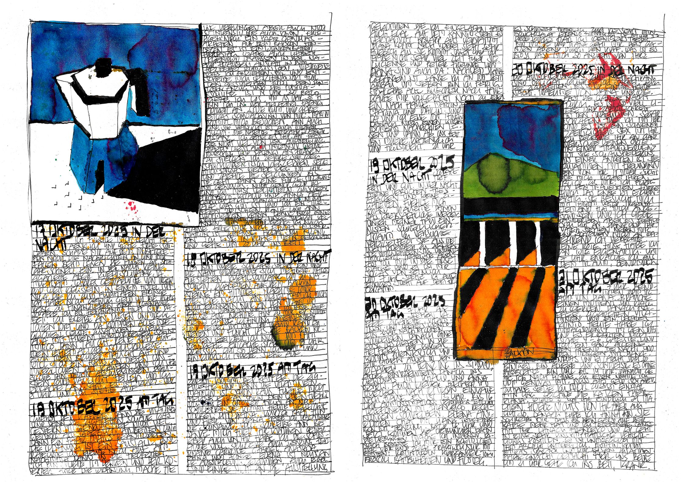 What begins as documentation becomes architecture:shadows, colours, fragments, systems — each page alive, each mark deliberate.This October–November cycle stands as a singular piece within a lifelong continuum, a work that has already found recognition far beyond Switzerland.