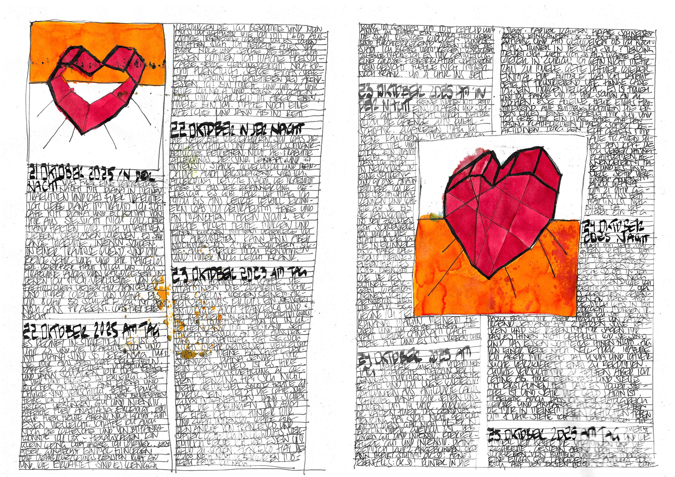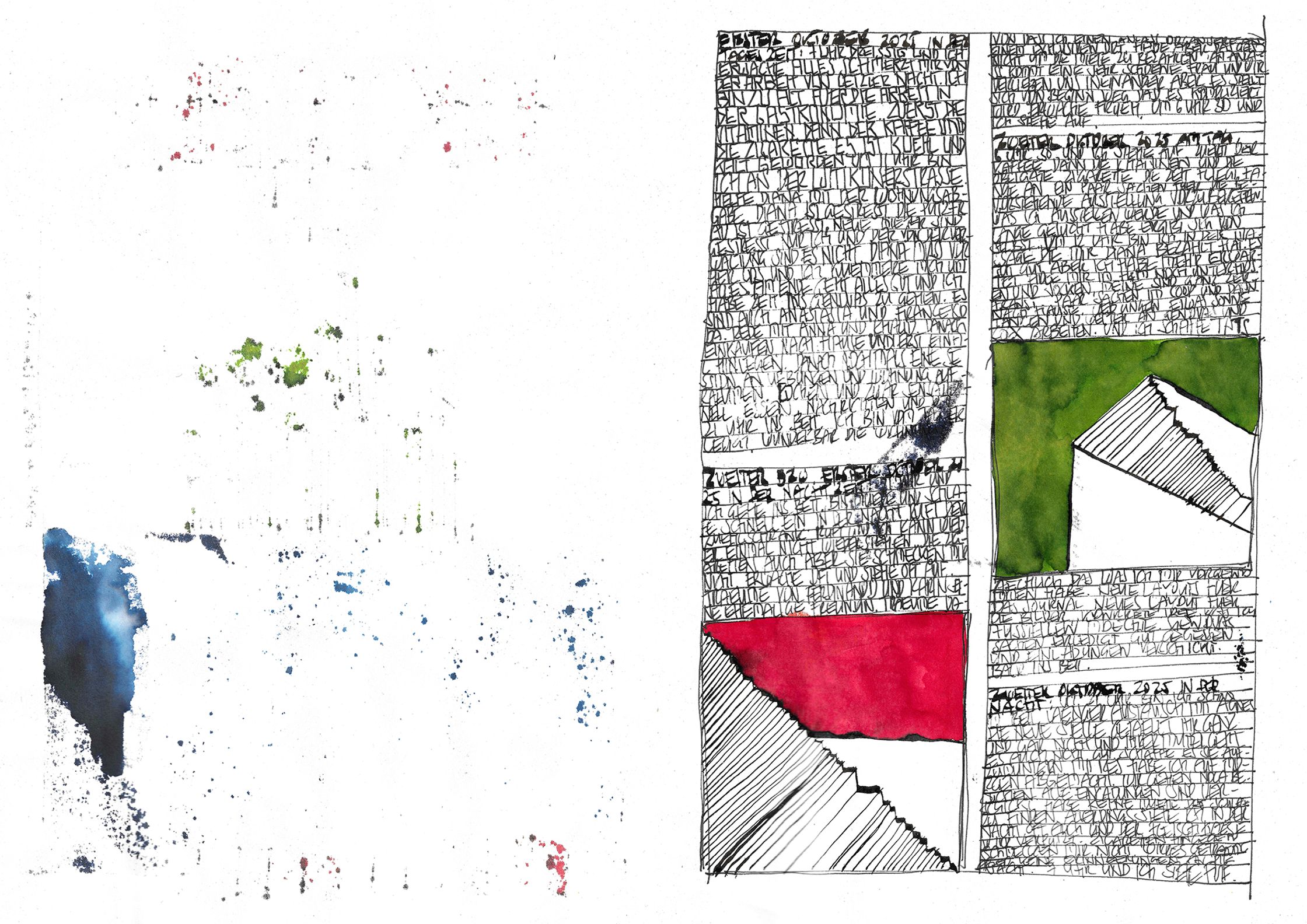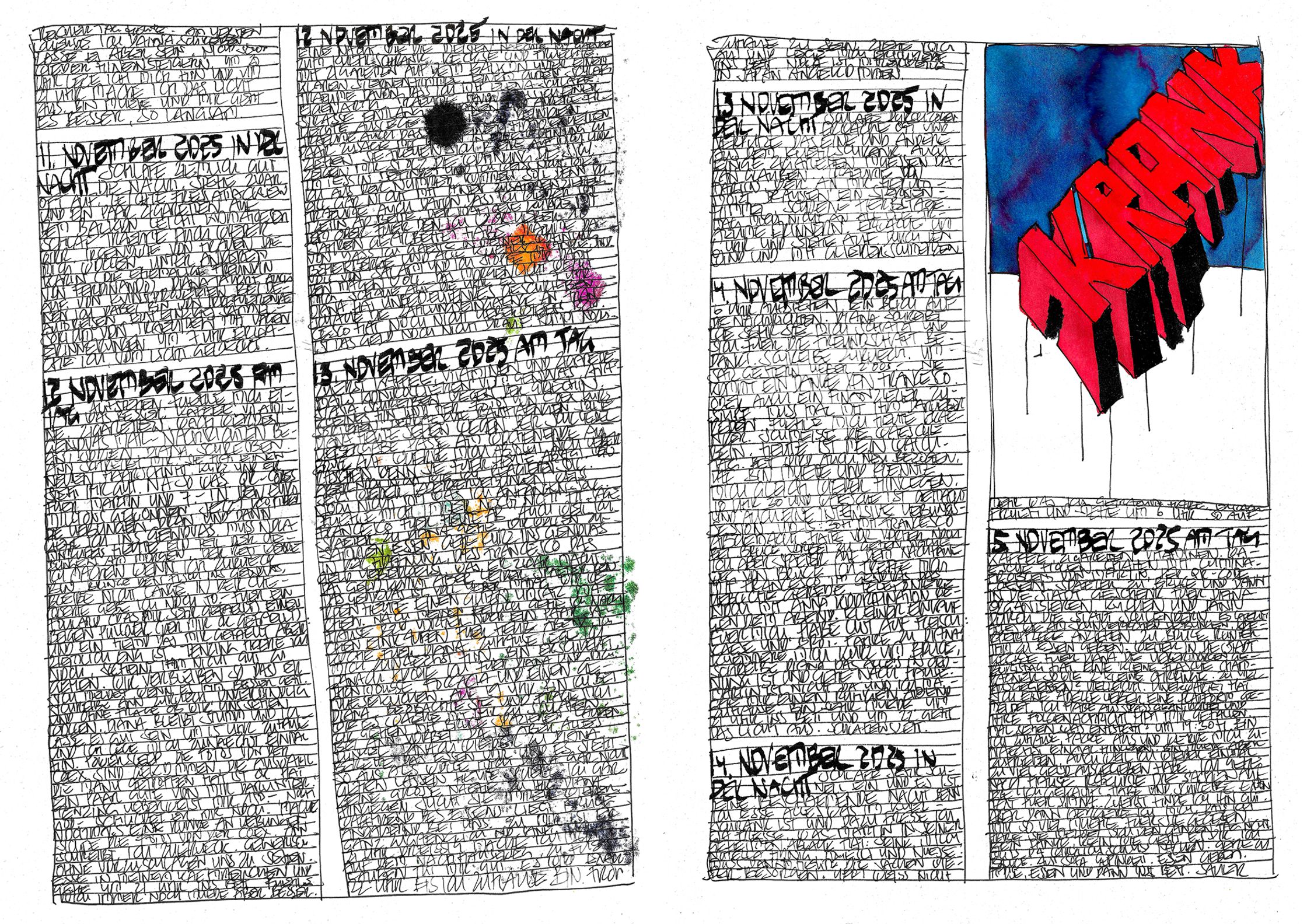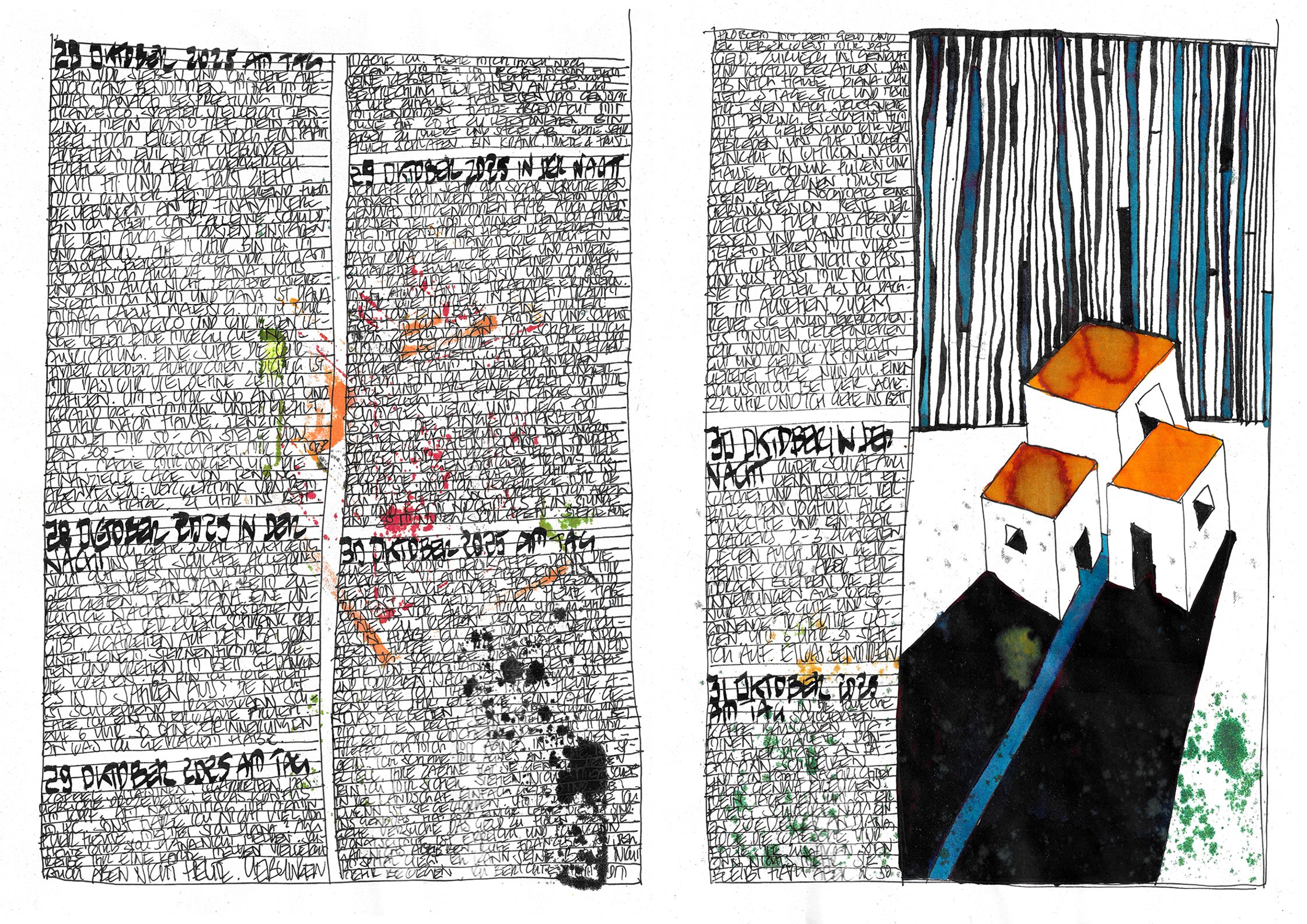 What begins as documentation becomes architecture:shadows, colours, fragments, systems — each page alive, each mark deliberate.This October–November cycle stands as a singular piece within a lifelong continuum, a work that has already found recognition far beyond Switzerland.