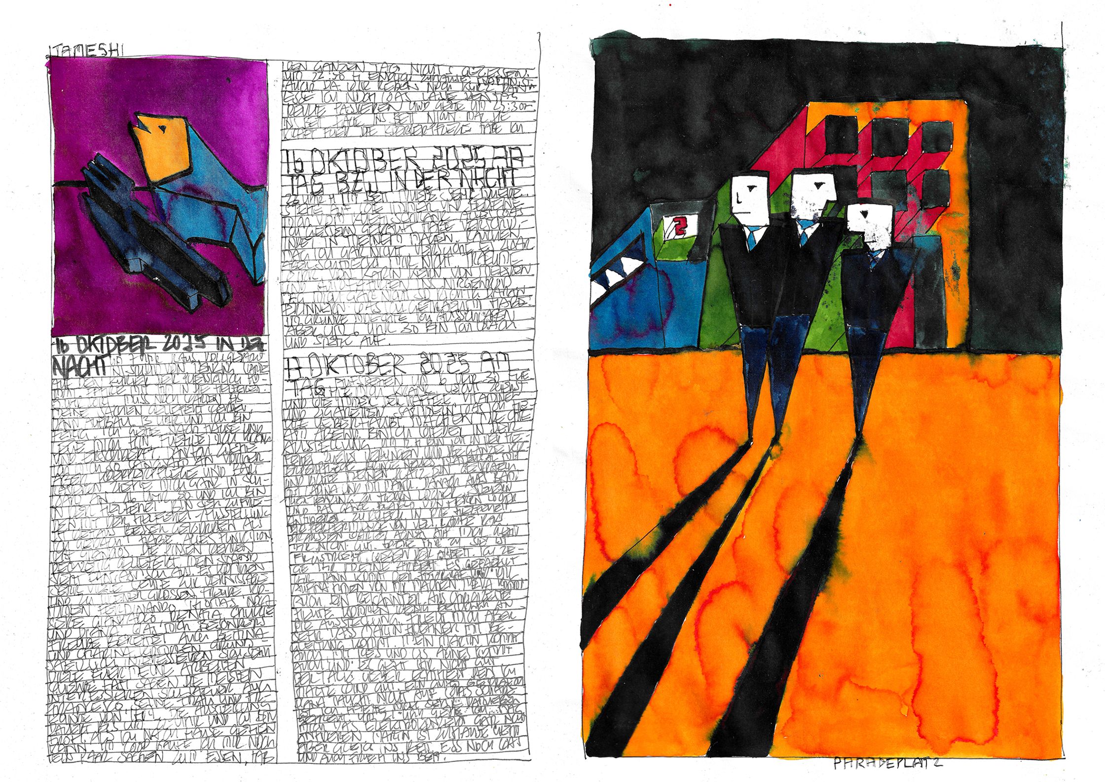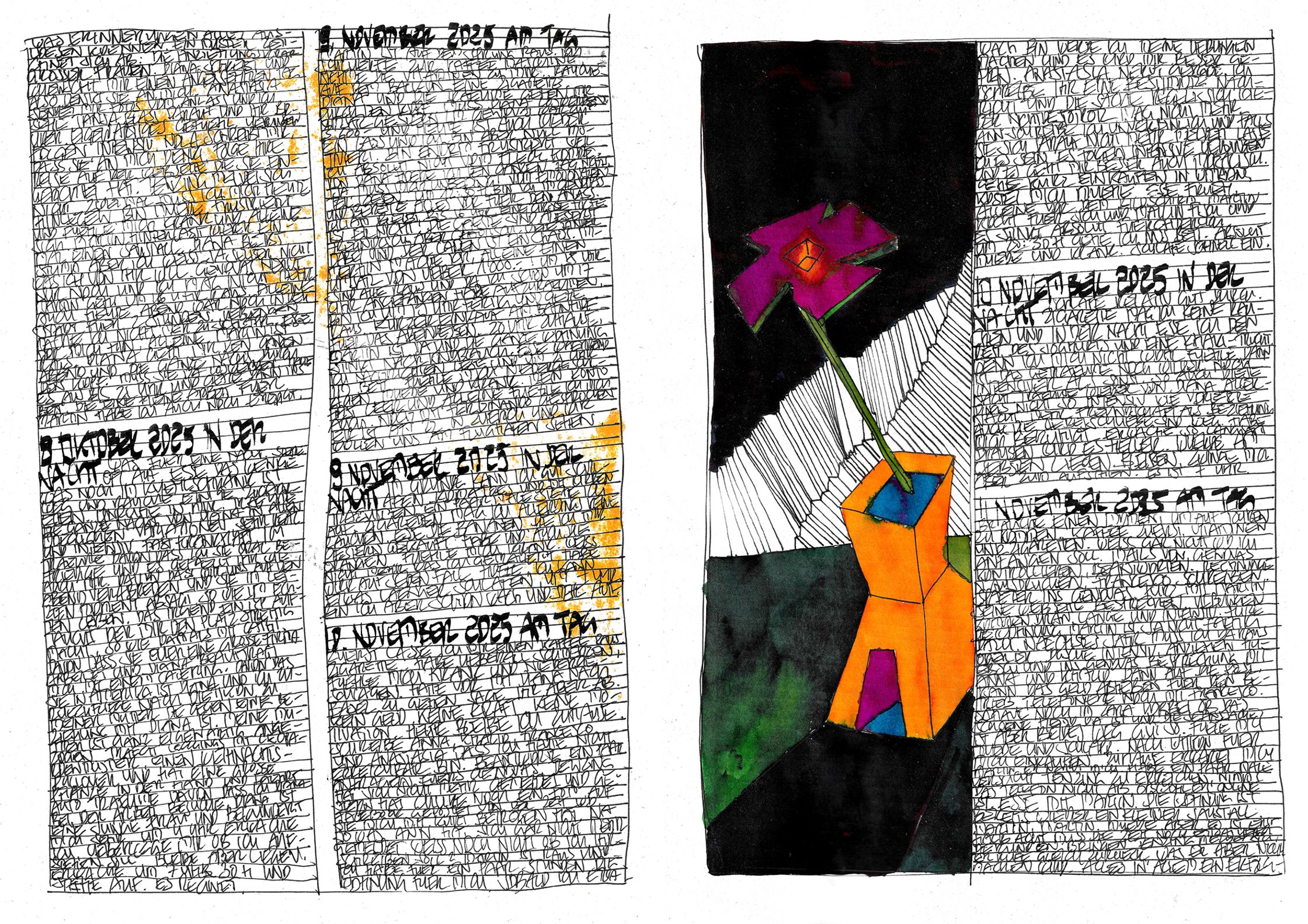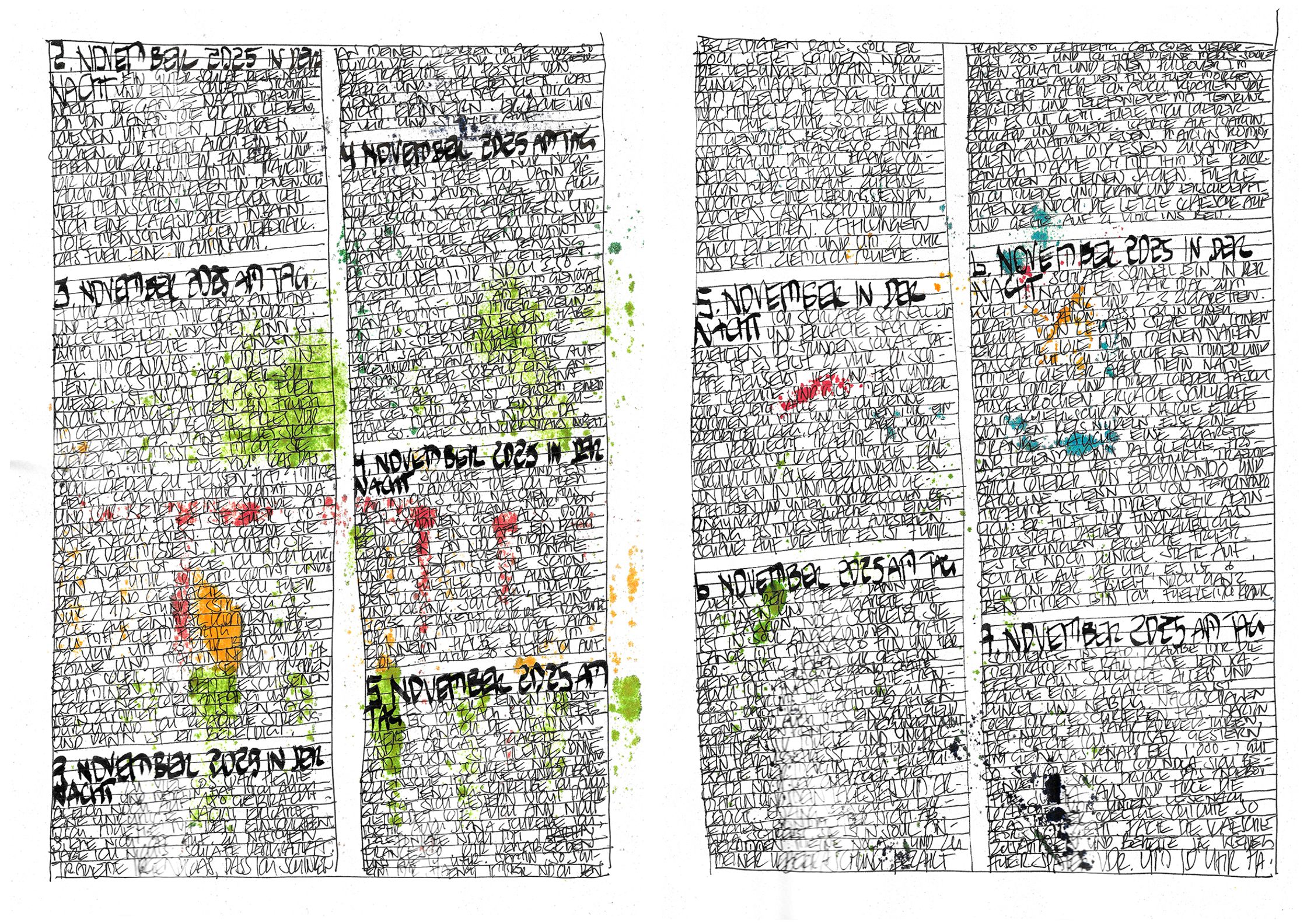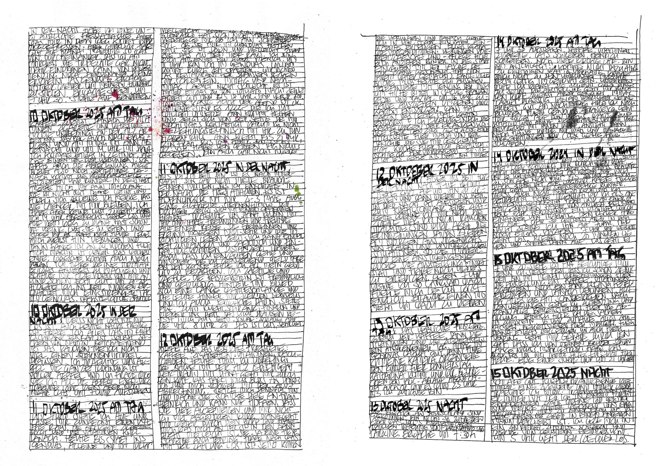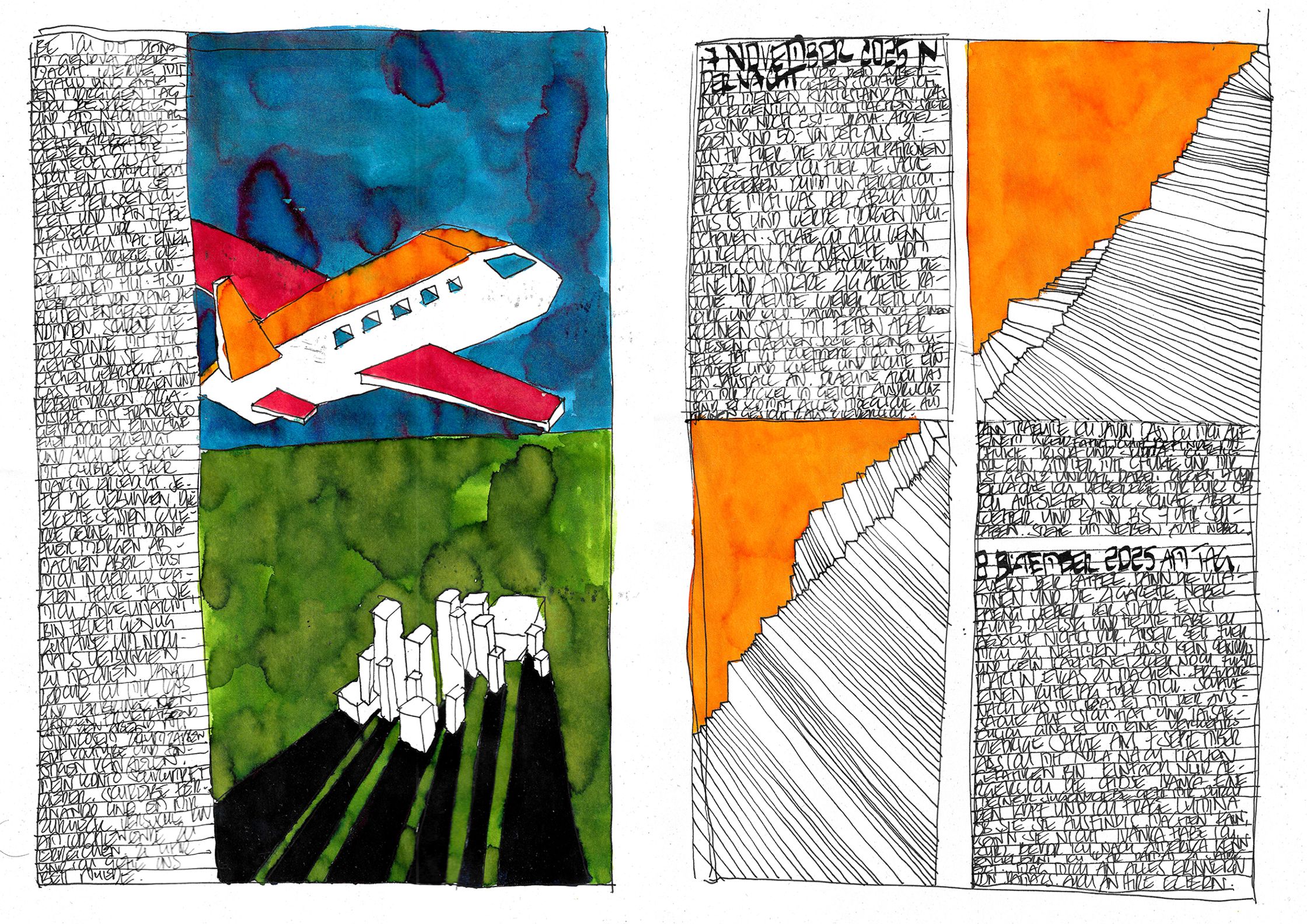 What begins as documentation becomes architecture:shadows, colours, fragments, systems — each page alive, each mark deliberate.This October–November cycle stands as a singular piece within a lifelong continuum, a work that has already found recognition far beyond Switzerland.