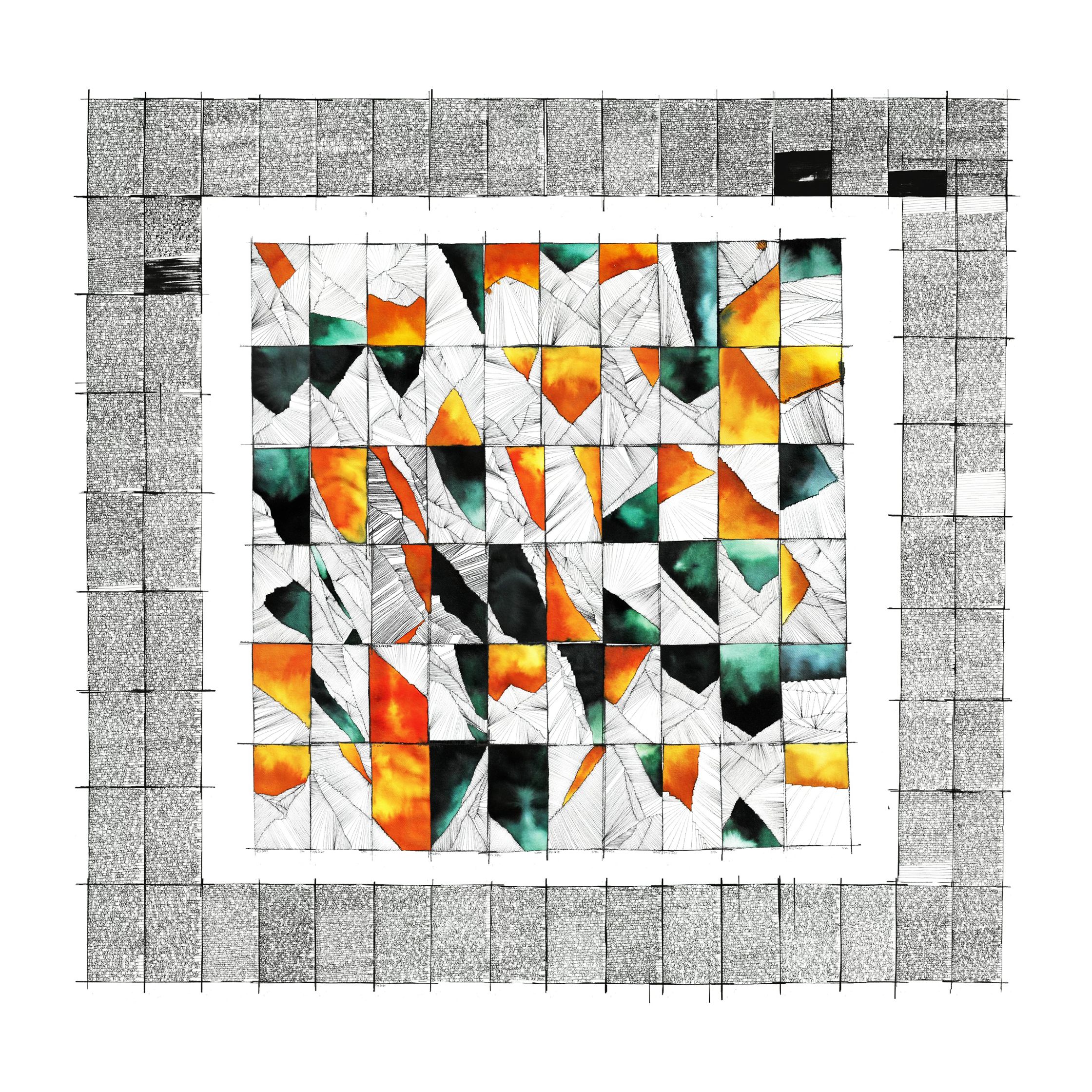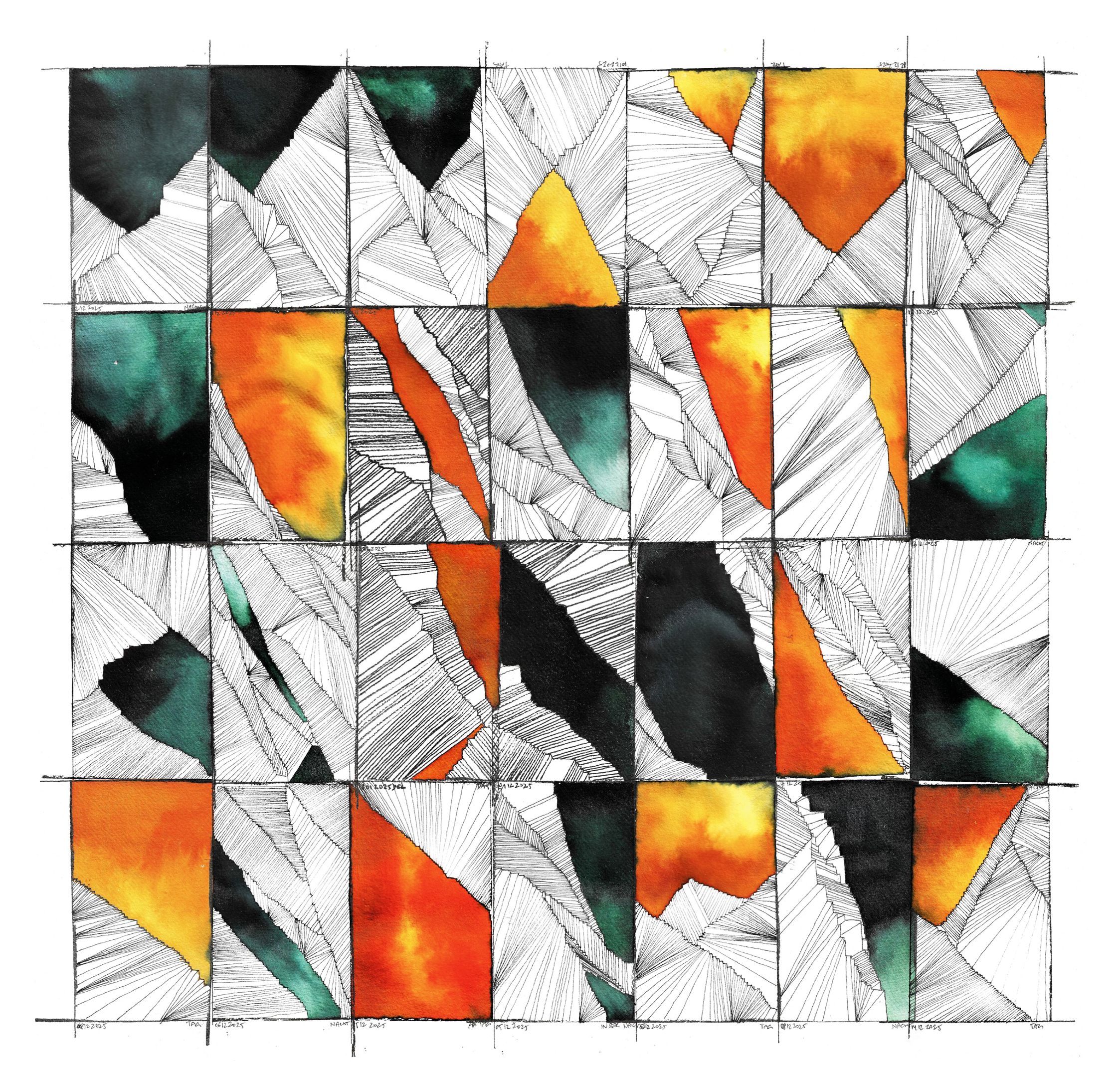 The grid structure functions as both frame and constraint. Within it, Buffoli records time through line density, shifts in direction, and restrained chromatic interventions. Color emerges sparingly — never decorative, never dominant — acting instead as a structural accent, a moment of pressure within an otherwise disciplined field. Each unit follows a clear internal logic, yet resists becoming formulaic. Difference arises through accumulation, not expression.